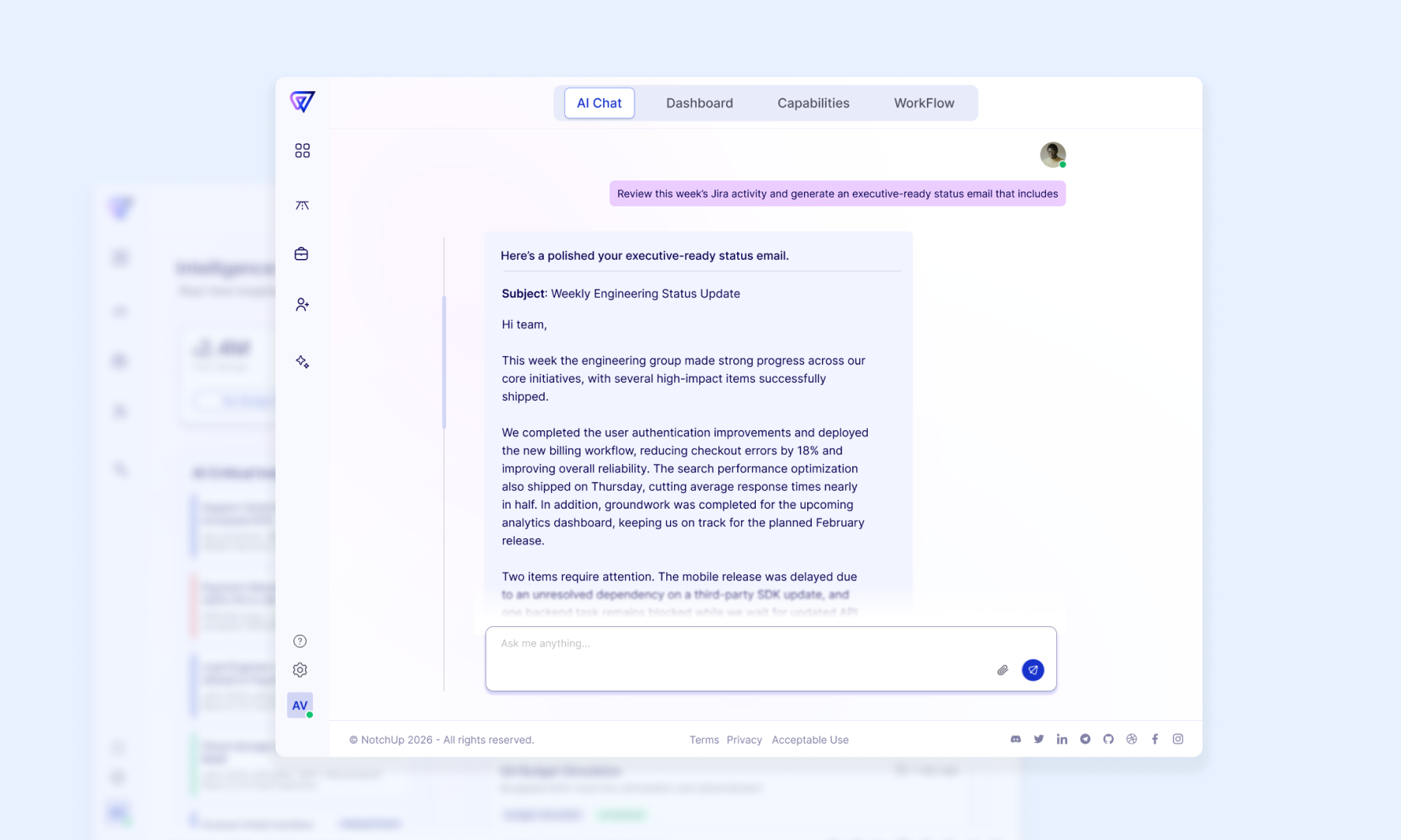 Stop spending Friday afternoons summarizing Jira tickets. AI aggregates progress, blockers, and shipped value into an executive-ready email instantly.